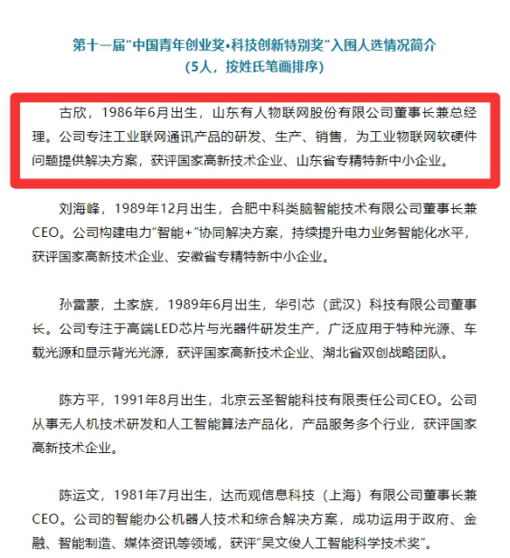 近日,在中国共产党成立100周年之际,共青团中央、人力资源社会保障部联合开展第十一届“中国青年创业奖”评选表彰活动。经过前期报名、初审、复评、终评等阶段,有人物联网/乐鱼网创始人古欣成功入围第十一届“中国青年创业奖•科技创新特别奖”评选名单。